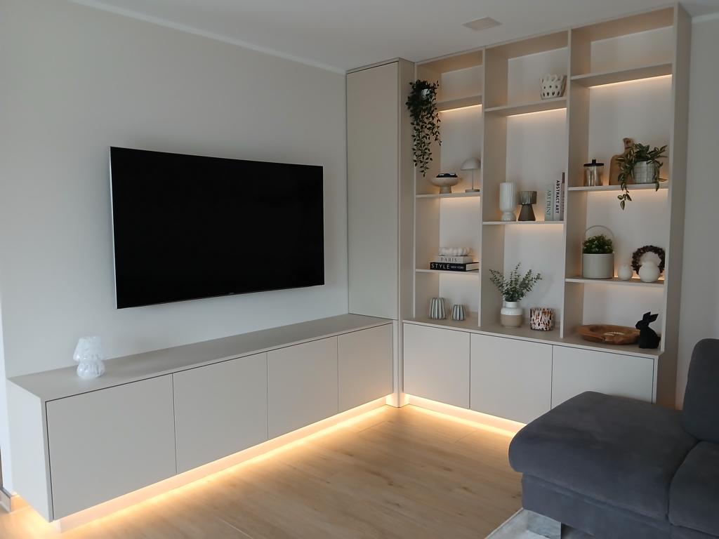 Schränke und Schrankwände für das Wohnzimmer können perfekt eingefügt werden.