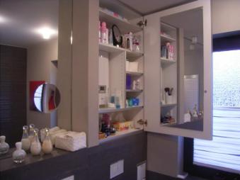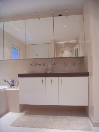 Sehr breiter Bad-Spiegelschrank nach Maß und Unterschrankmit lackierter Hochglanz-Oberfläche.