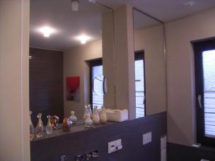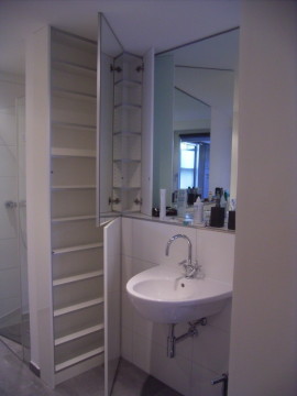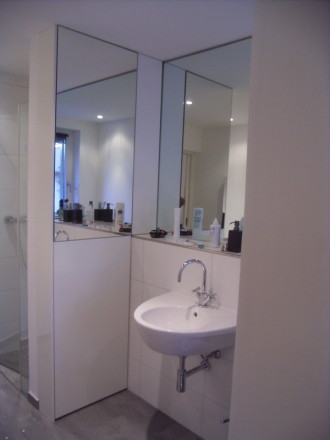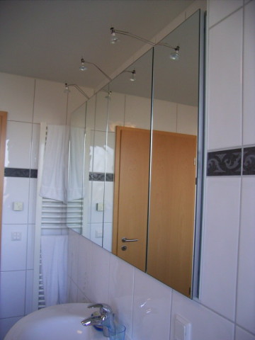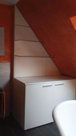Der Oberschrank musste an der rechten Tür parallel zur Schräge angefertigt und ein entsprechender Spiegel geschnitten werden.