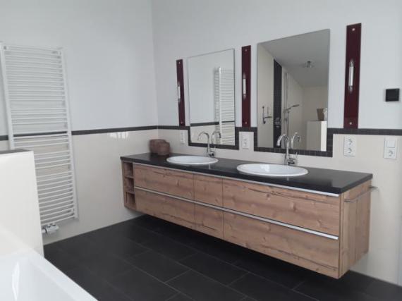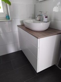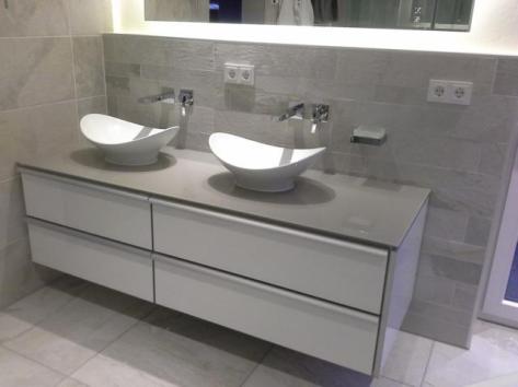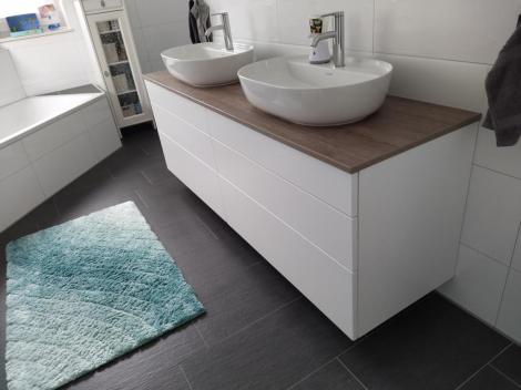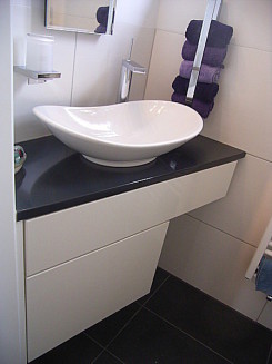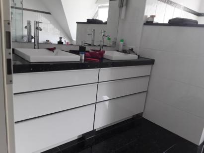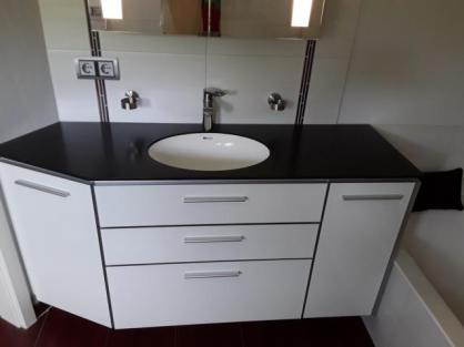 Da war der Spiegel noch nicht montiert. Hier haben wir eine Waschtischplatte in der trendigen Stärke 12mm mit Mineralwerkstoffbecken geliefert und den gewünschten Unterschrank mit Türen und Schubladen angefertigt.