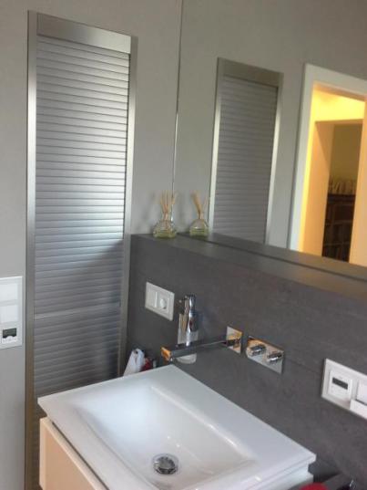 Schwer zugängliche Nische mit einer Edelstahlrollade nach Maß anstelle einer Tür.