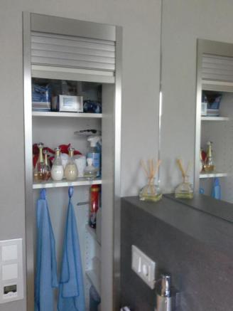 Sie sehen in der schmalen Nische, daß der Teil rechts hinter der Alu-Rollade nach Maß ebenfalls ausgebaut und so nutzbar wurde.