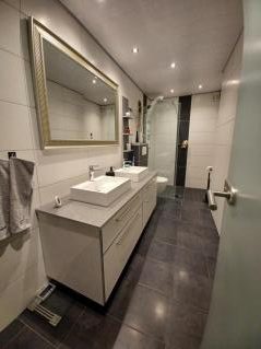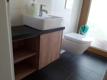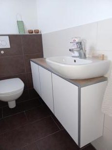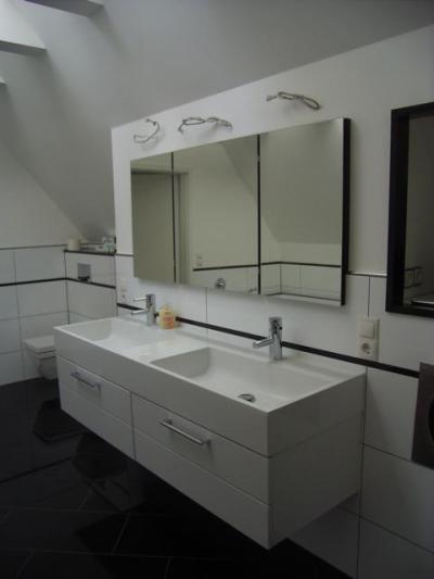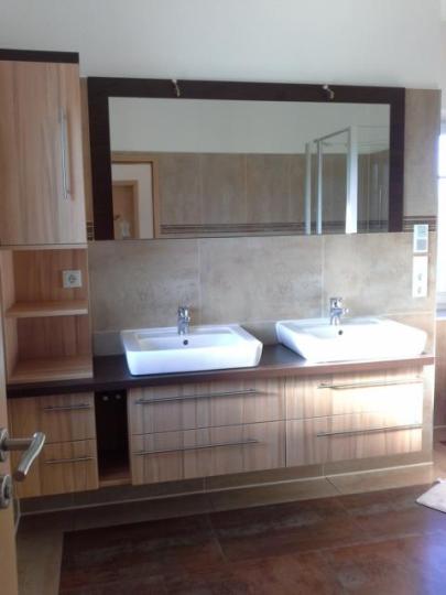 fast in jedem Bad gibt es heute diese Nischen oder Absätze, bei denen sich immer wieder die Frage stellt: wie ausnutzen?In diesem Fall war der Spiegel vorhanden und wir haben die Nische rechts ausgebaut.