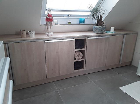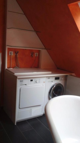 Hier ging es darum, in einem sehr wohnlichen, kleinen Bad, den Maschinen den Techniklook durch eine Umblendung nach Maß zu nehmen und aus dem gleichen Grund die Wasserhähne verschwinden zu lassen.