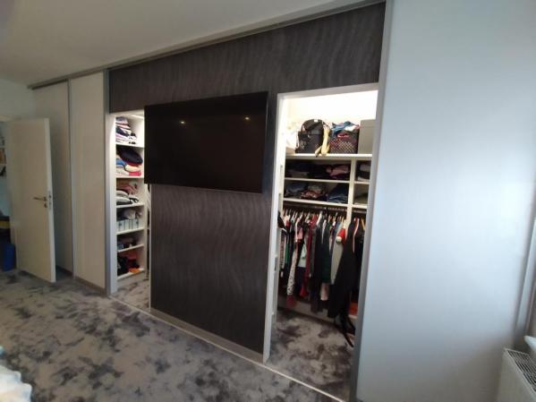 Vielleicht etwas ungewöhnlich, aber wenn Sie sich in diesem Raum befinden, sehr angenehm. Diesen begehbaren Schrank nach Maß haben wir in eine Raumecke gebaut. An die Wand links haben wir ein Flat-TV montiert.