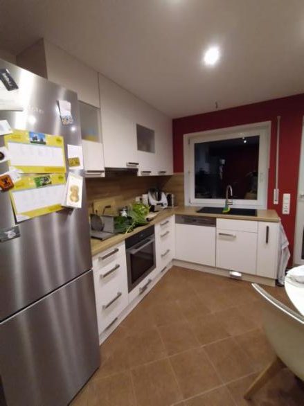Hier mal eine renovierte Küche in Bremen. Wir haben die Oberschränke ergänzend nach oben aufgebaut und anschließend mit deckenhohen Möbeltüren nach Maß geschlossen. Die anderen Fronten wurden ebenfalls erneuert, der Dunstabzug umblendet, der Kühlschrank umblendet und überbaut und schließlich eine umlaufende Lichtblende eingebaut.