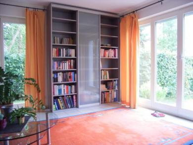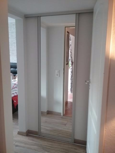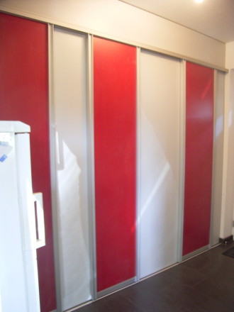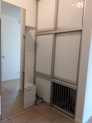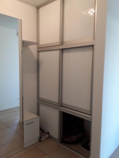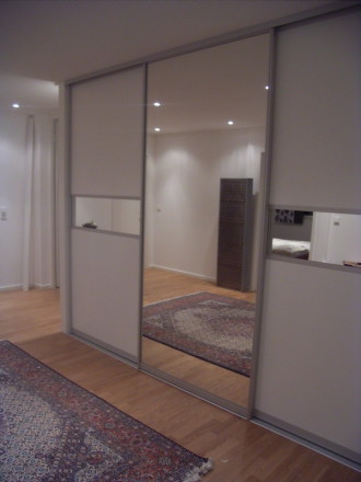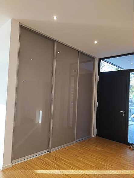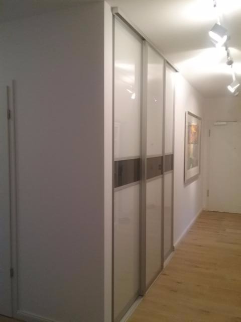 Hiwer mußte eine Lösung für den Hund gefunden werden, der hin und wieder kurz eingeschlossen werden muß. Wir fertigten diesen Gleittürenschrank nach Maß mit der kleinen Gittertür unten und fertigten alle anderen Türen mit einer Füllung in Glas Lacobel weiß.