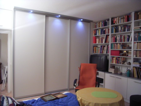 die beiden Gleittüren nach Maß laufen auf der selben Schiene, also einläufig. Die jeweils öffnende Tür wird vor das offene Regal geführt. So hat die Wand mit geschlossenen Türen die volle Symetrie.