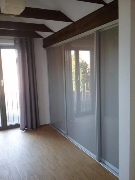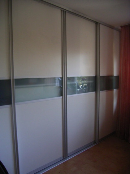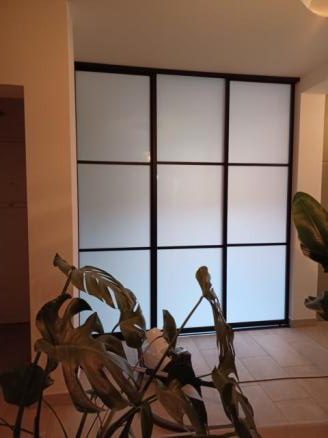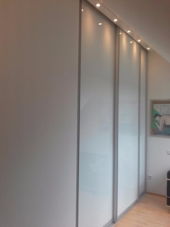 Hier wurden in die Gleittüren nach Maß zur Auflockerung satinierte Glasteile eingebaut.