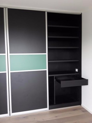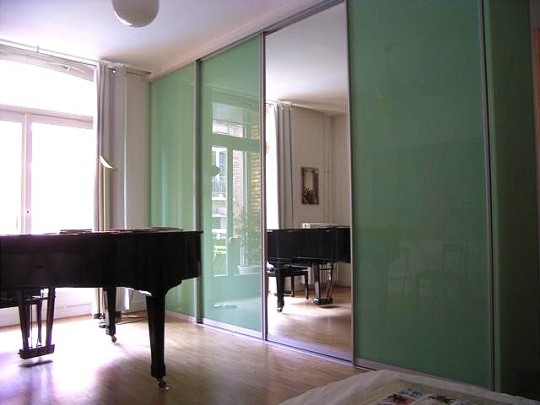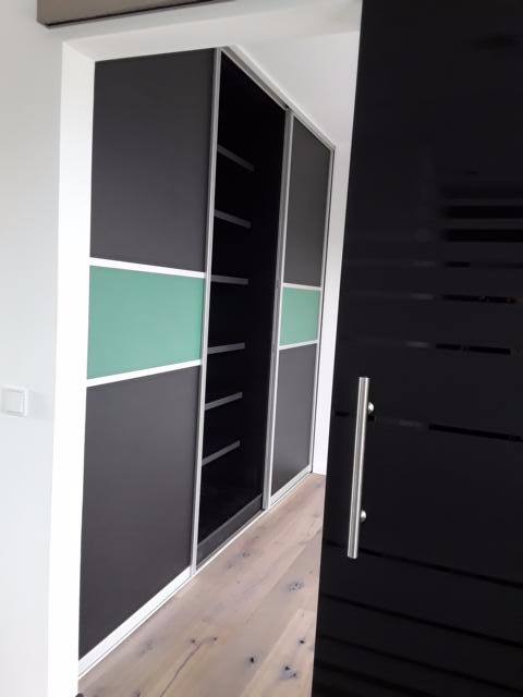 Gleittüren nach Maß vor Kleiderschrank mit grün lackiertem Glas als Füllung