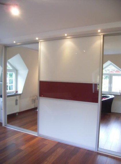 Sie sehen einen Schrank mit Gleittüren nach Mass, von denen zwei vollverspiegelt wurden. Als Blickfang dient das Mittelfeld. Entsprechend Kundenwunsch wurde hier von uns das dunkle Rot auf Glas lackiert und nach oben und unten durch sogenannte die Füllung teilende Sprossen von den beiden weiss lackierten Gläsern abgetrennt.