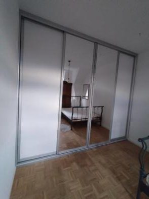 Gleittüren-Kleiderschrank nach Maß mit Spiegeltür rechts und links. In der Mitte eine Füllung aus rückseitig weiß lackiertem Glas .